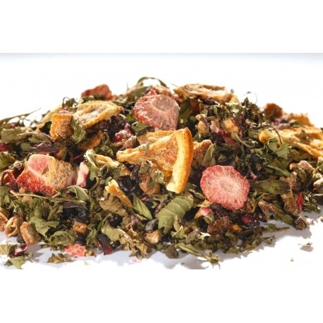 Mieszanki owocowo - kwiatowe nazywane są potocznie herbatami, choć często nie zawierają liści krzewu herbacianego. W zależności od składu mają odmienne właściwości zdrowotne, smak i aromat. Mieszanka Tea LOVE z truskawką i miętą, jak sama nazwa wskazuje, zawiera sporą dawkę liści mięty, która ogranicza ochotę na słodycze, zmniejsza dolegliwości żołądkowe, działa bakteriobójczo, antystresowo. Zapach mięty relaksuje i odpręża.
